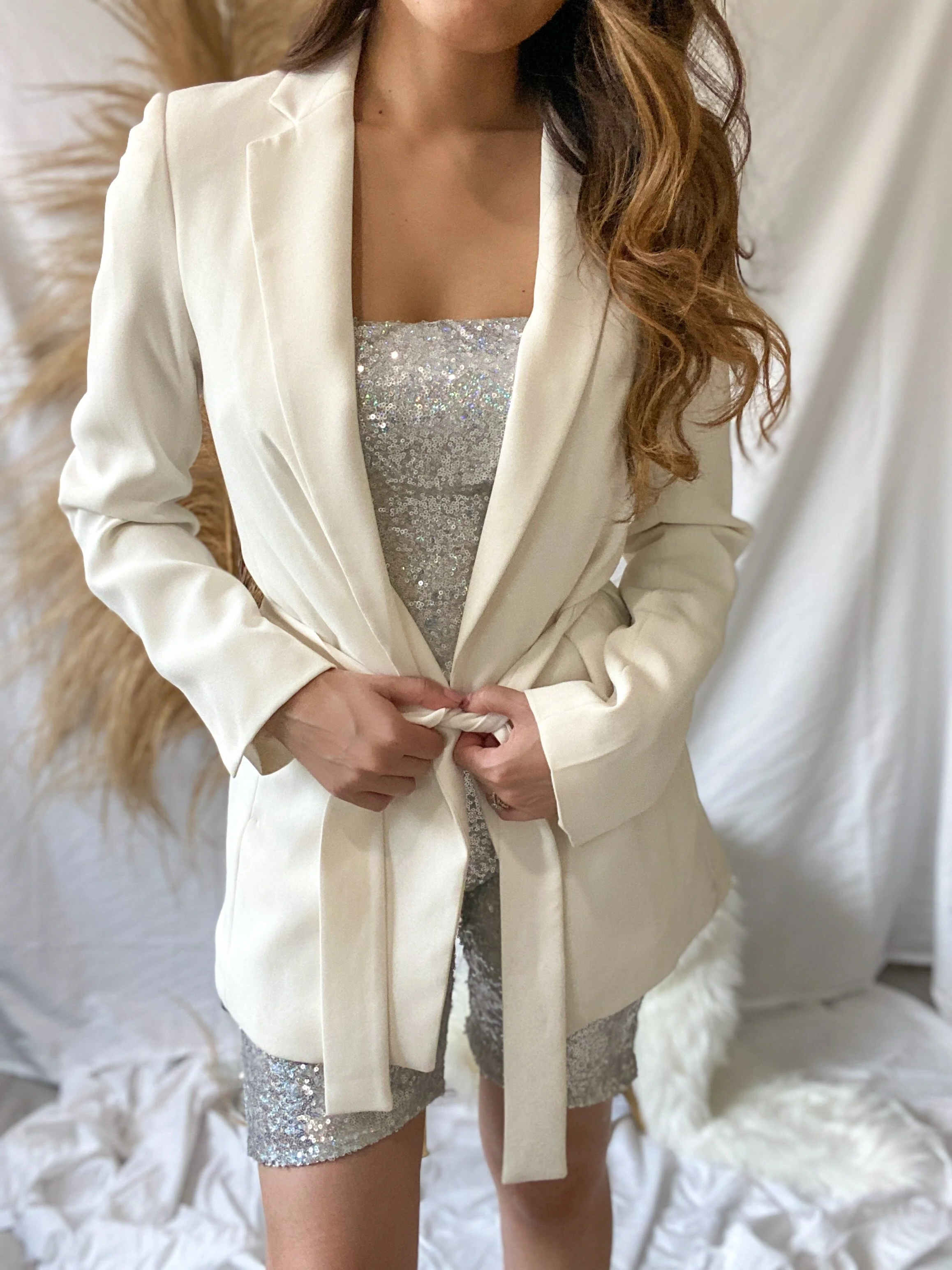 Welp, simple solve just throw a comfy blazer over the sparkles sequins outfit. It really tones down the whole look and gives a classy grownish vibe. When you’re ready to party deep in the night throw off the blazer and problem party solved!